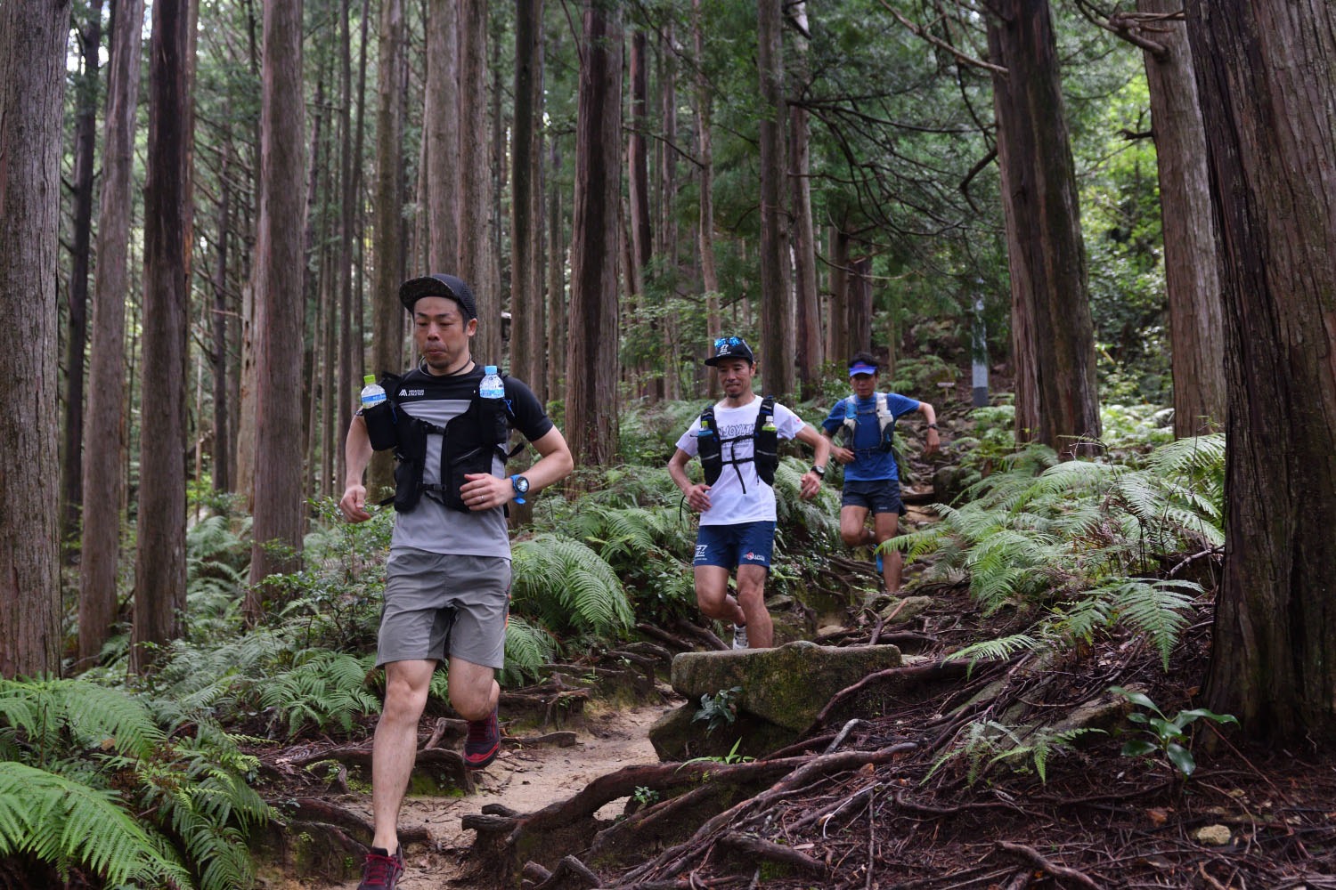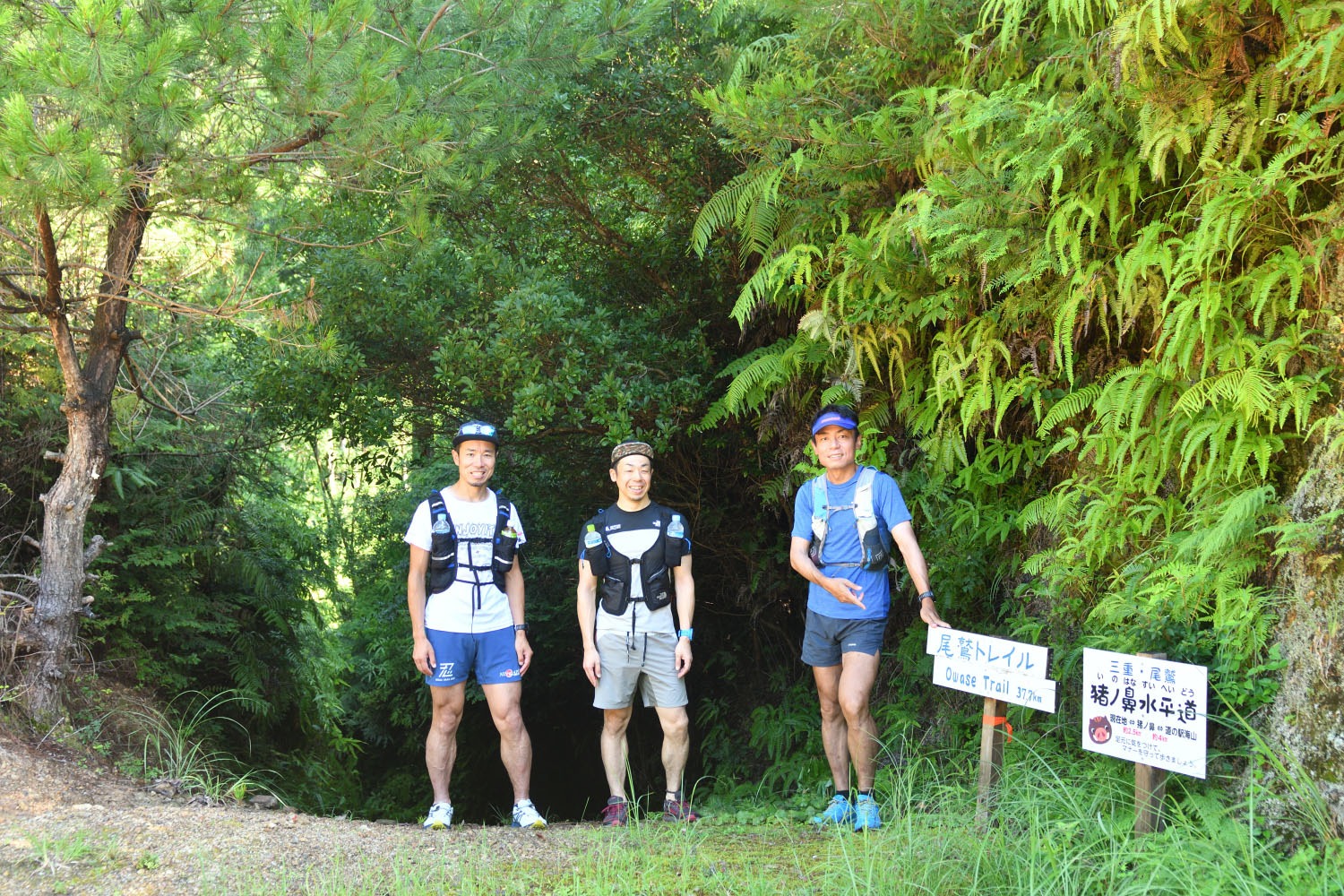 ナビゲートしてくれたのは尾鷲トレイルを知り尽くした吉澤将典さん、トレイルランナーとして初めて通しで尾鷲トレイルを走破した清川健治さんに加え、忍者トレイルラン ニングレース主催者の恵川裕行さん。 実はこの尾鷲トレイルのことを教えてくれたのは、昨年走破したばかりの恵川さんだった。「スキーでいう、バックカントリー的なコースを楽しめます」。見せてもらった数枚の写真で完全に引き込まれてしまった。