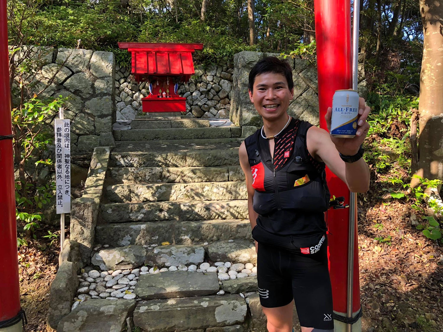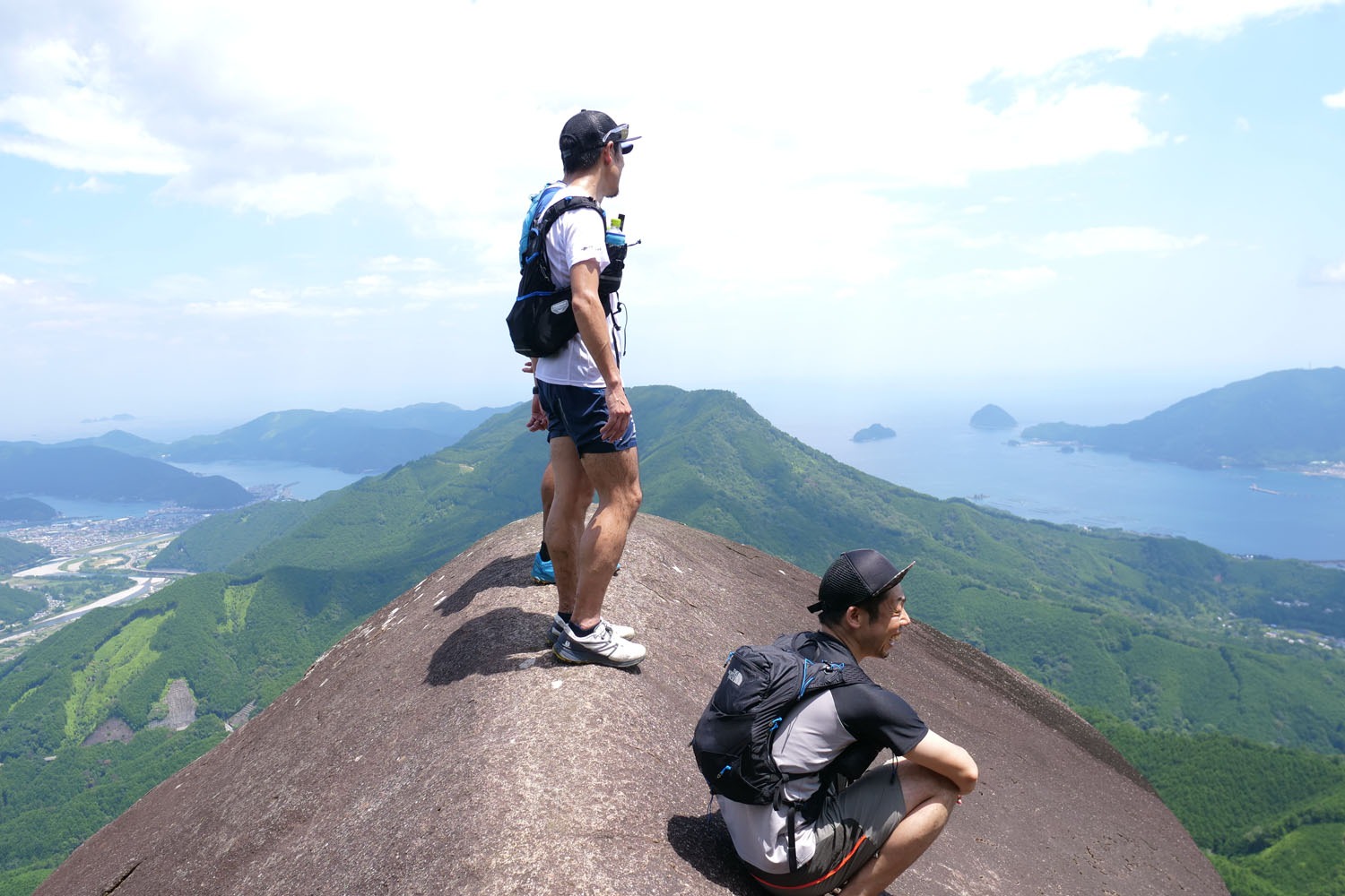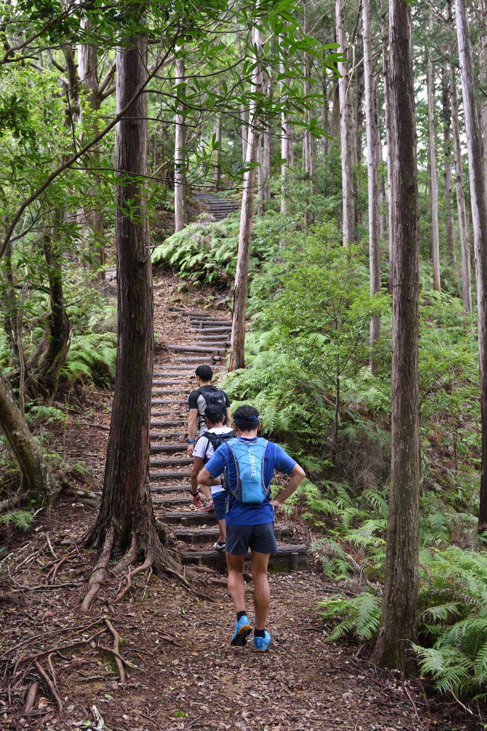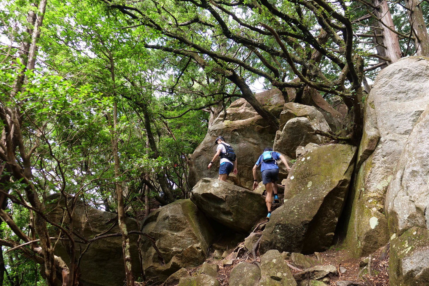 コースの起点は猪ノ鼻水平道となる。約2・5㎞は海に近いフラットなトレイルを進むが、そこから約2・5㎞で標高約500mまで登ってオチョボ岩、天狗倉山(てんぐらさん)を踏んで行く。走れる区間はどこも短く、急斜面が続く。 次は標高599mの便石山(びんしやま)だが、意地悪いことに一度標高220mまで下がってから登り返さないといけない。しかも便石山の登りのほとんどは木段。30℃超の気温もダブルパンチとなり、何度もノックダウンしそうになった。