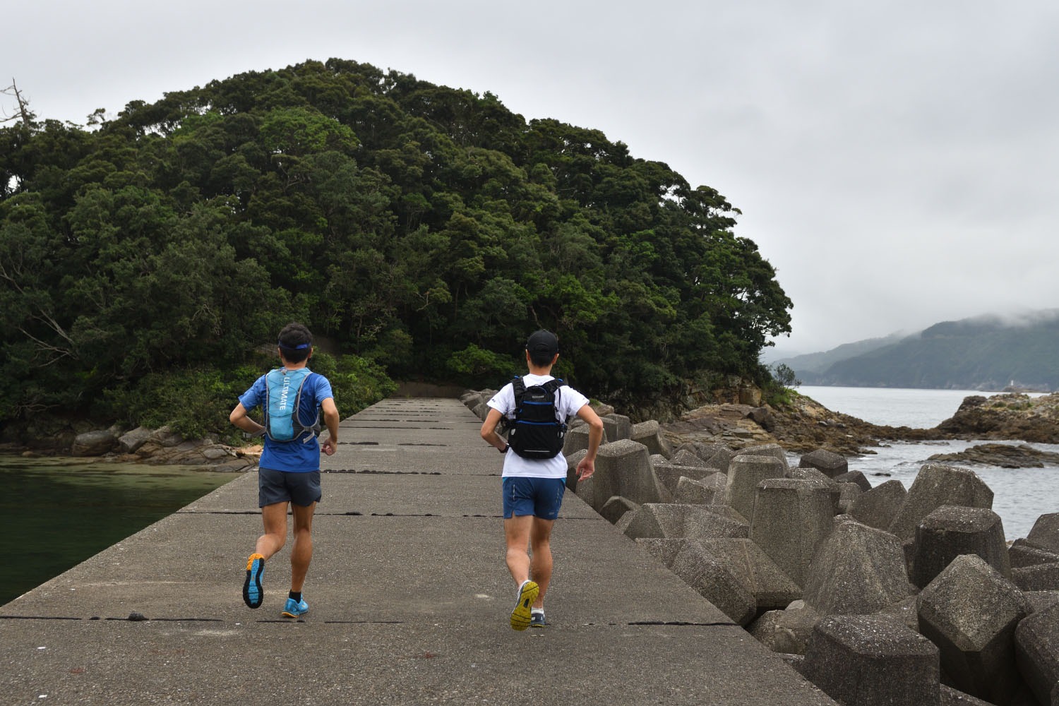 南尾鷲トレイルは再び山の形相が変わり、比較的走れるルートが多い。終盤には再び海を感じられ、ゴールは漁港を抜けた先、海に浮かぶ宮島にある弁財天神社の鳥居前だ。
