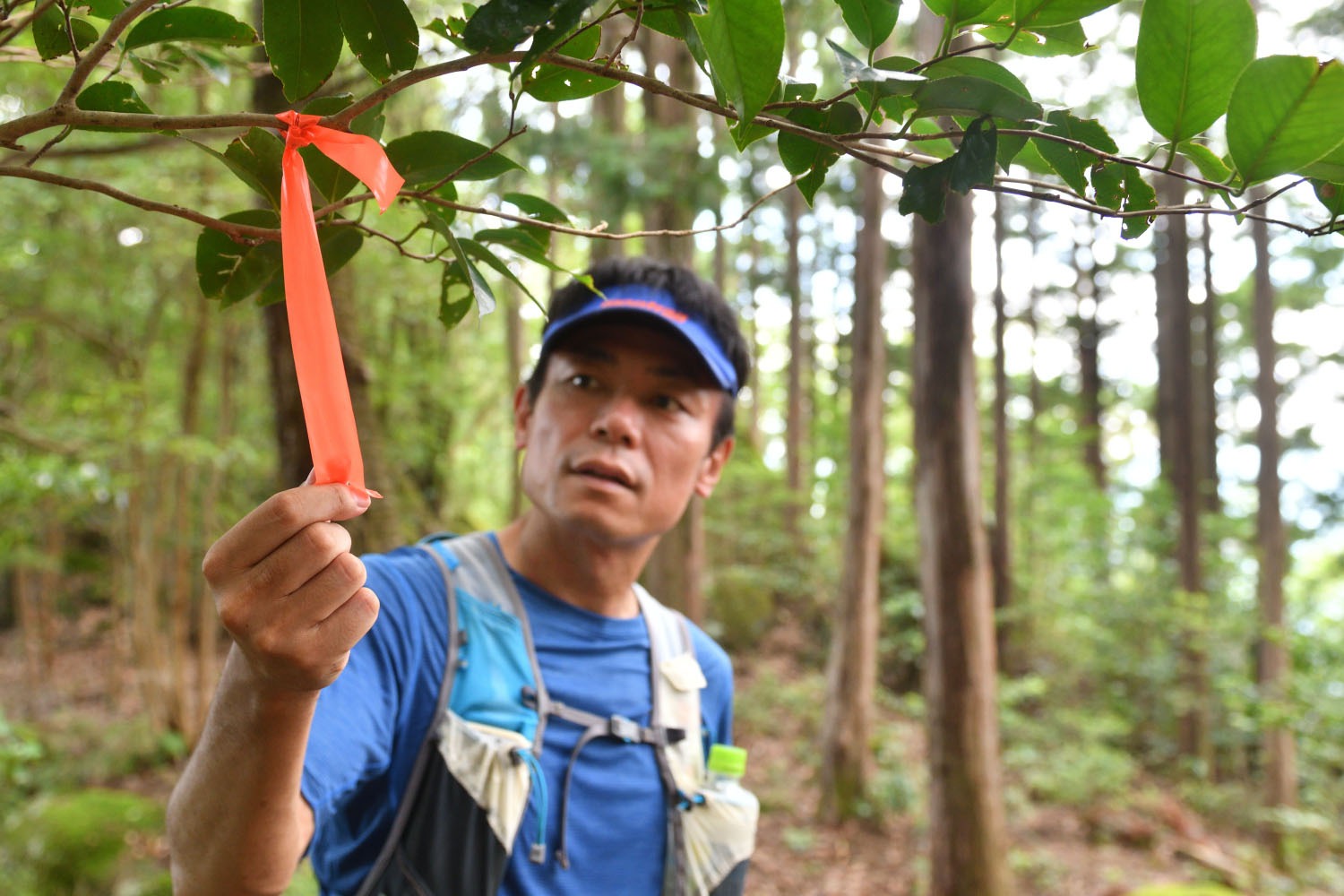何度か行ったことがあれば尾鷲トレイルで迷うことはないが、初めてコースに踏み入れた時は戸惑うポイントが何カ所か出てくるだろう。基本は1㎞ごとに「尾鷲トレイル」の道標(右写真)が設置され、細かい区間にオレンジのマーキングテープ(上写真)が付けられているので、それを頼りにするといい。